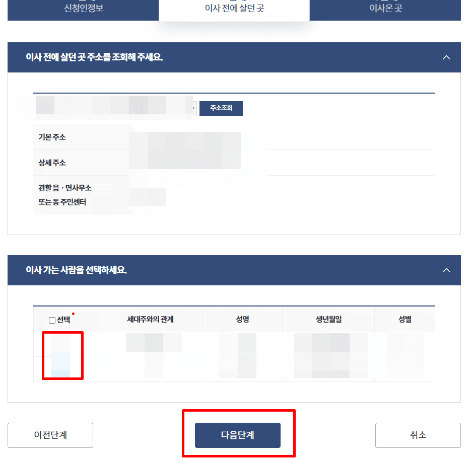 6-1. 주소 조회 시 아래와 같이 조회된 주소가 노출되며 이사 가는 사람 선택이 가능합니다.