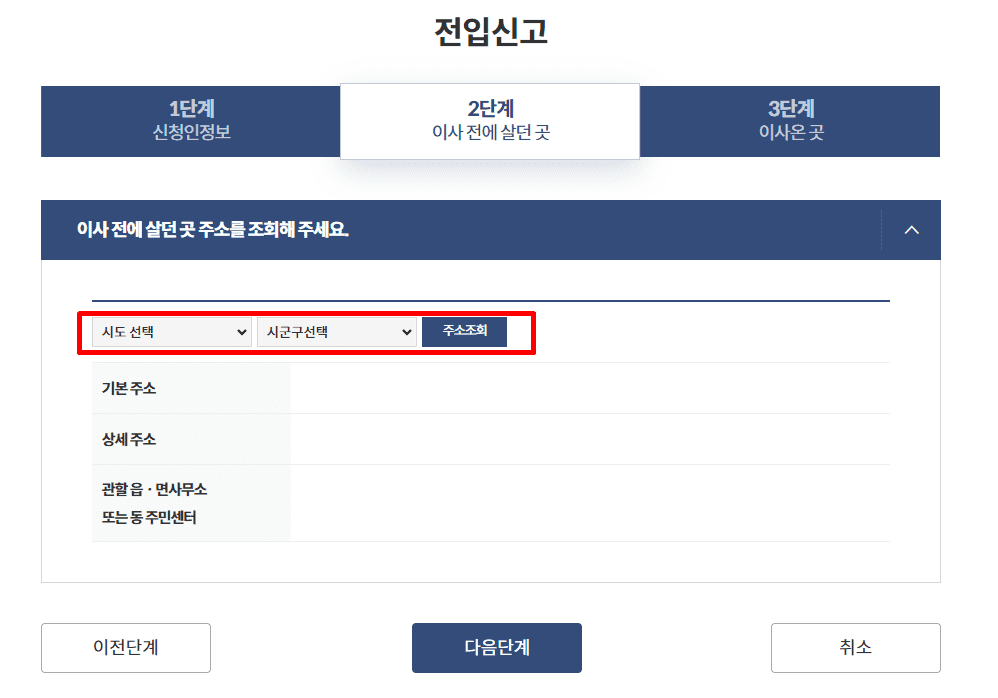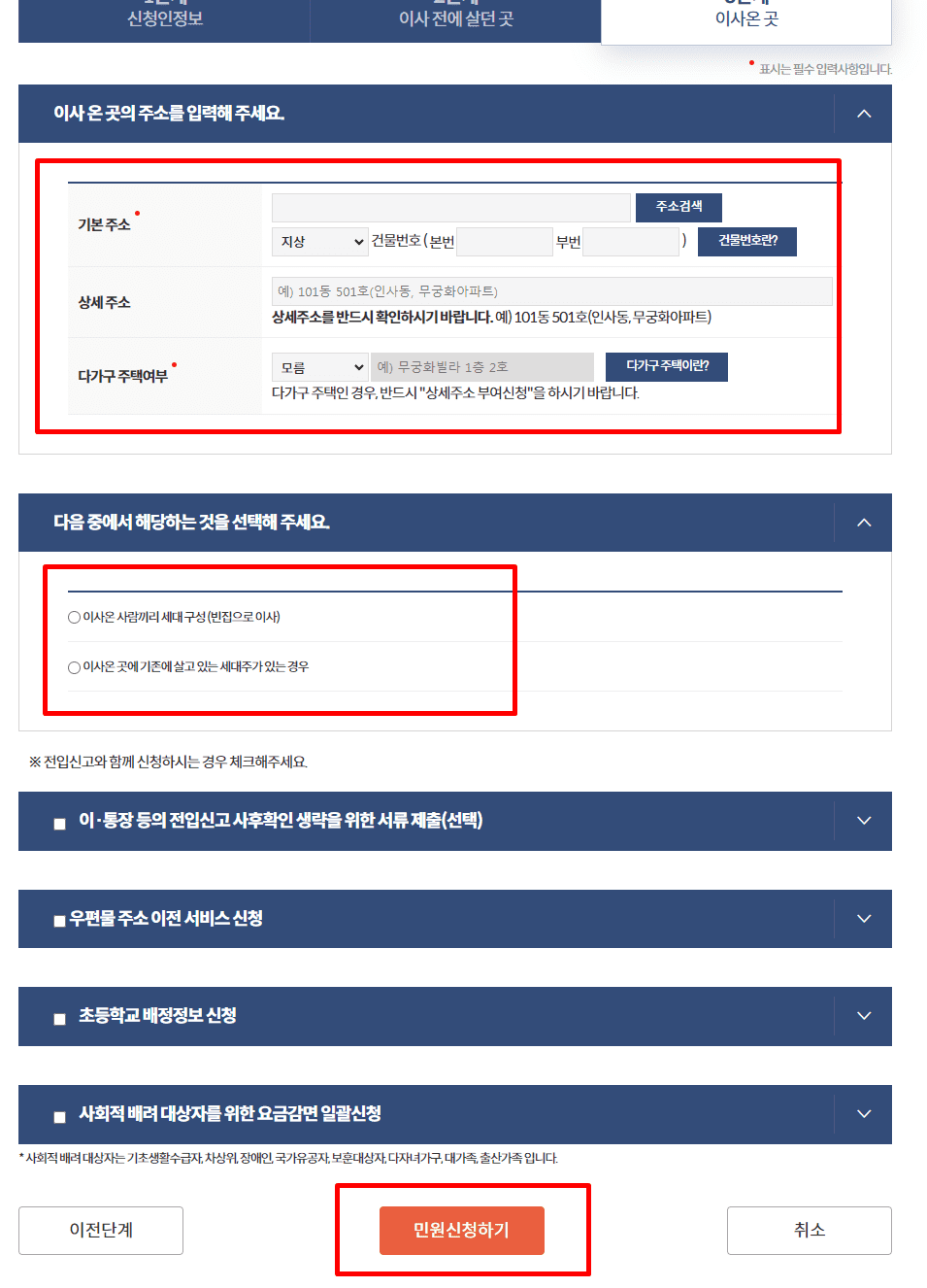 이사 온 곳의 주소를 입력해 주시고 아래 해당 하는 것을 선택해 주세요.