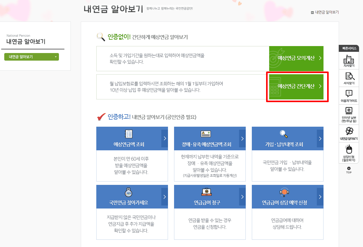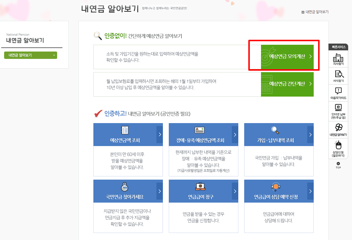 미래에 예상 수령액이 궁금하시다면 아래와 같은 방법을 이용해주세요.(단, 공인인증 필요)