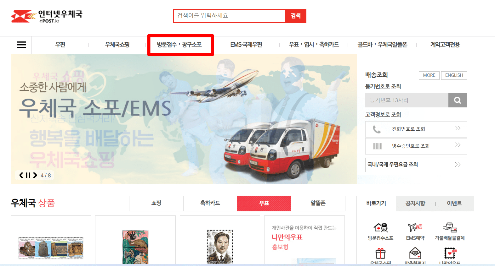 1. 우체국사이트에 진입하셔서 [방문접수·창구소포] 메뉴를 선택해 주세요.