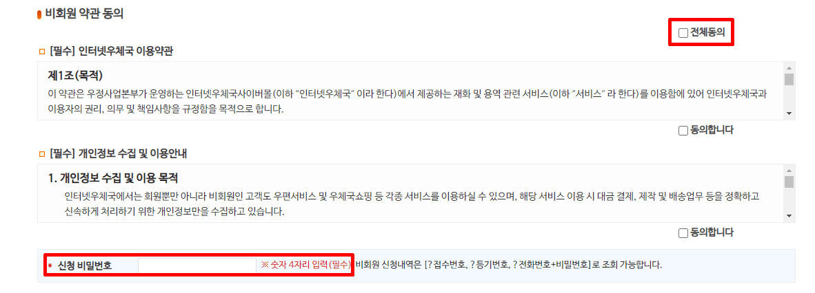 '전체동의'를 선택해 주시고 하단 신청 비밀번호를 입력해 주세요.