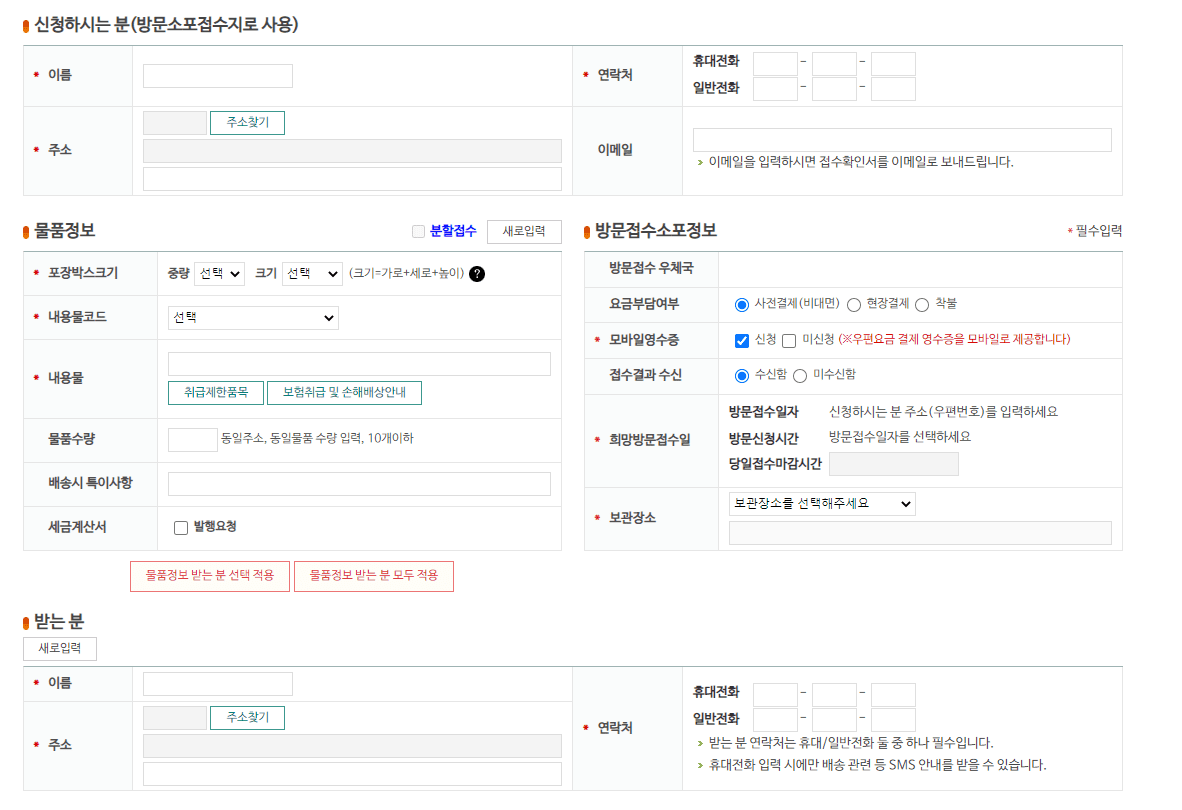 - 방문접수소포정보