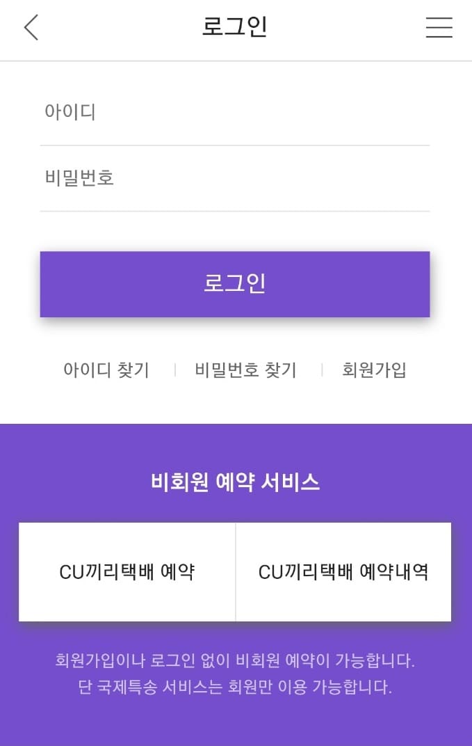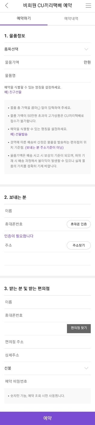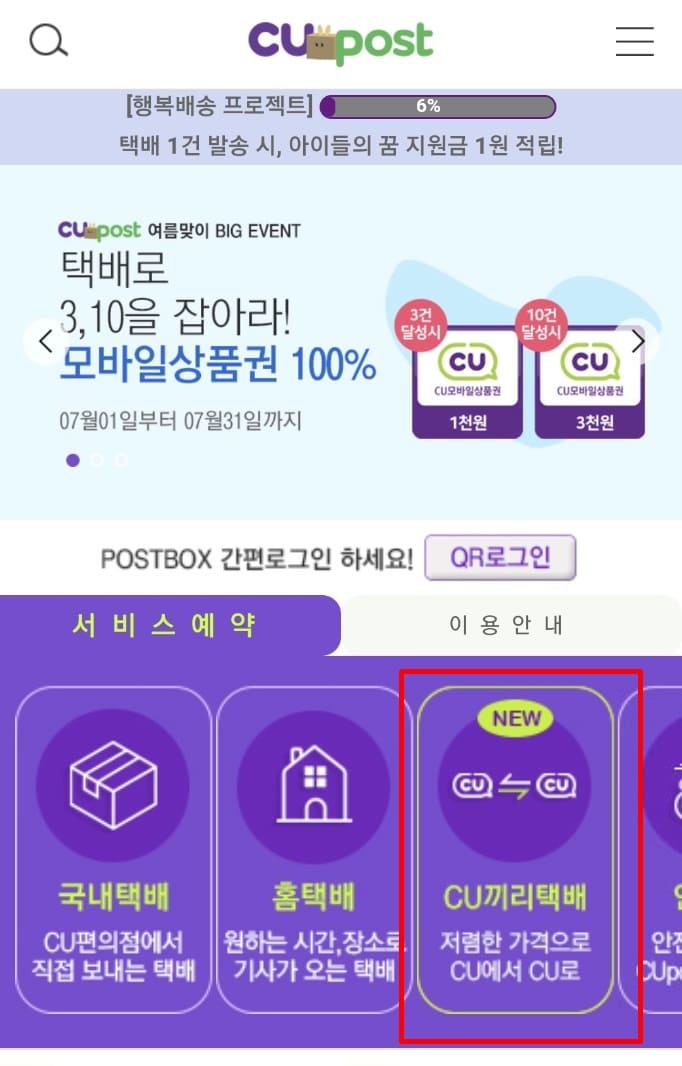 4. [CU끼리택배 예약] 을 선택하여 비회원 접수로 진행하도록 하겠습니다.