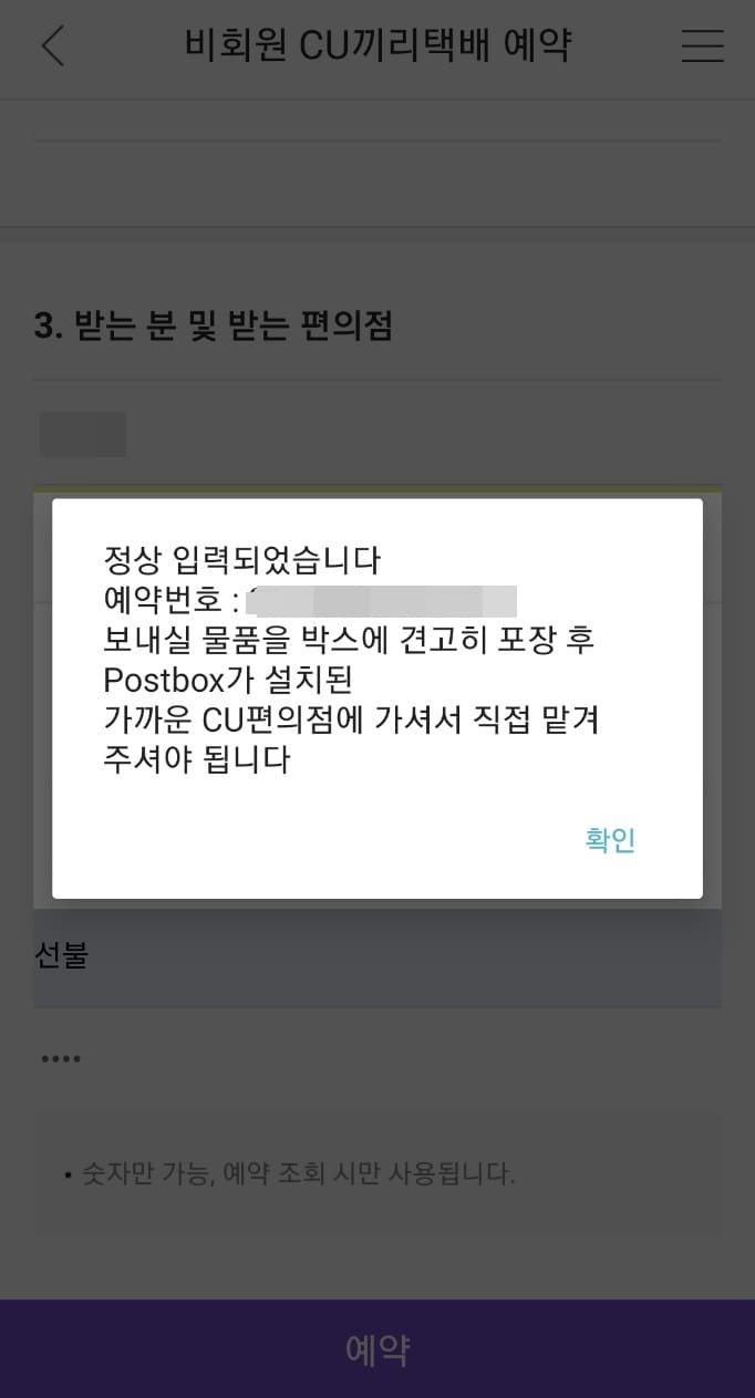7. 이제 예약은 완료 되었고 CU 편의점에 가셔서 택배 보내는 기계에 예약번호를 입력하신 후 물품의 무게를 재셔서 접수 완료해주시면 됩니다.