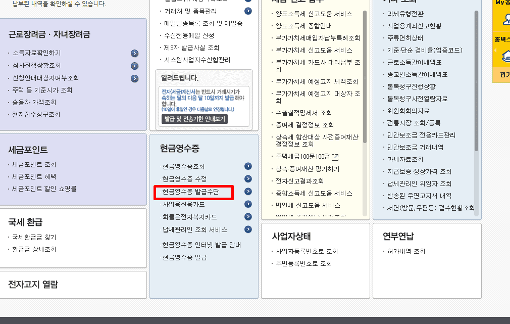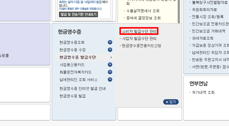 2. 해당페이지에서 현금영수증 - 현금영수증 발급수단을 선택해주세요.