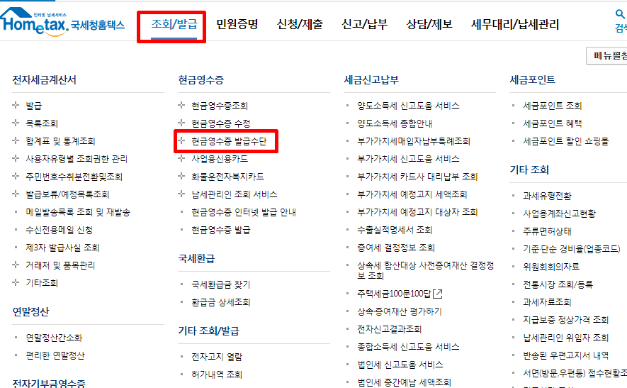 1. 상단 조회/발급 > 현금영수증 발급수단을 선택해주세요.
