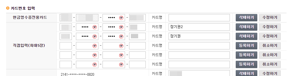 5. 아래 화면에서 직접입력 란에 정기권 뒷면에 있는 카드번호를 입력해줍니다.