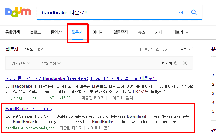 1. 아래와 같이 검색창에 handbrake 다운로드를 검색하신 후 '웹문서' 탭으로 이동하시면 HandBrake 다운로드 페이지가 검색결과에 노출됩니다. 클릭하여 사이트 접속을 해주세요.